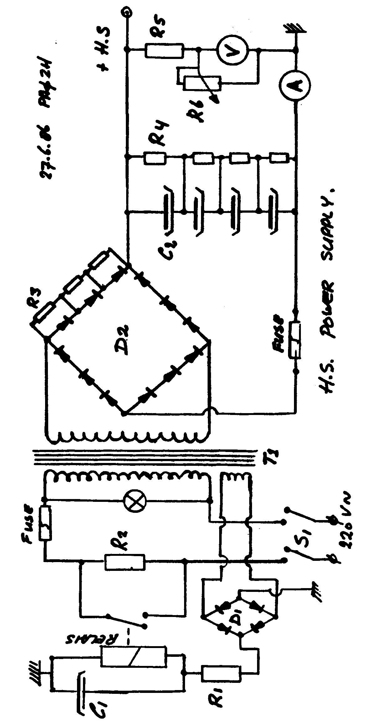 Vervolgens gaan we de HS via een weerstand R5 van 1M en een