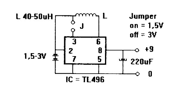 ‚‚n of twee penlight batterijen kan omgezet worden naar 9V. Het IC TL496 van