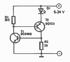 twee transistoren en twee weerstanden. De schakeling kan aangesloten worden op