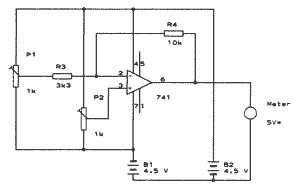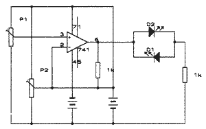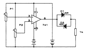 instelpot P1. P2 zo instellen, dat de spanning 0V is en P1 -1V. Op de uitgang