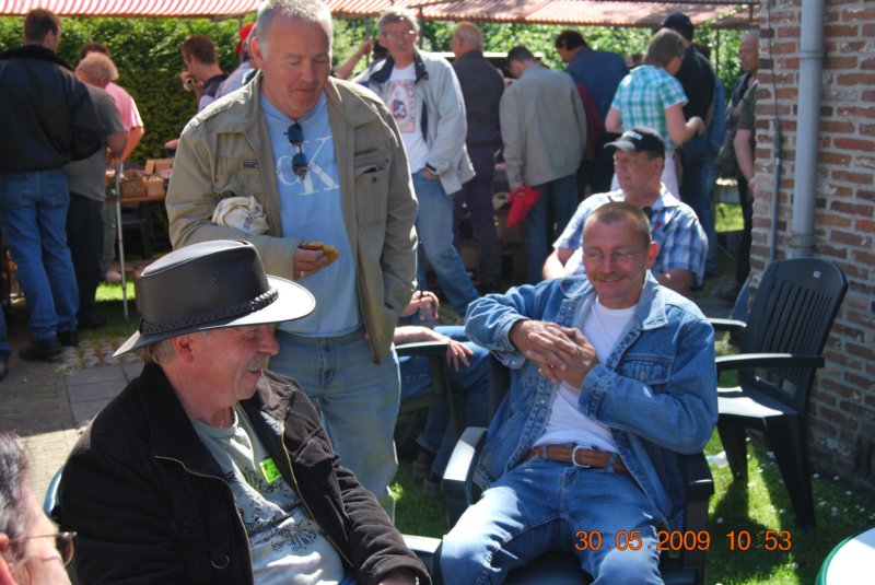 Op het terras buiten is het ook gezellig. Froukje (l) in gesprek met Klaas Huitema - DK6HK uit Duitsland. Recht Pieter - PDoPPK.
